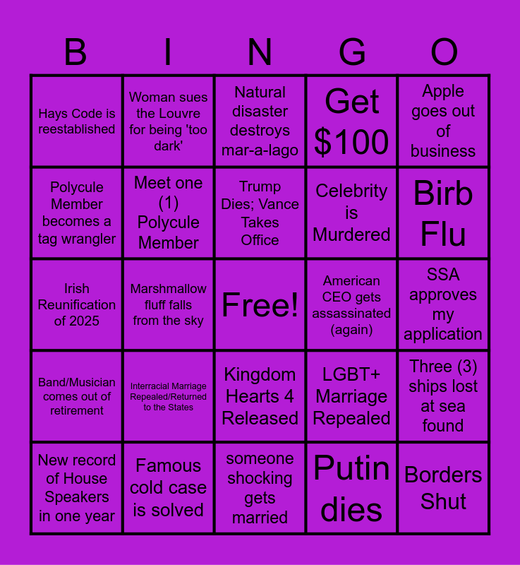 This bingo card has a free space and 24 words: Interracial Marriage Repealed/Returned to the States, Famous cold case is solved, Trump Dies; Vance Takes Office, New record of House Speakers in one year, Apple goes out of business, Hays Code is reestablished, Polycule Member becomes a tag wrangler, Woman sues the Louvre for being 'too dark', American CEO gets assassinated (again), Kingdom Hearts 4 Released, Celebrity is Murdered, Irish Reunification of 2025, LGBT+ Marriage Repealed, Three (3) ships lost at sea found, Meet one (1) Polycule Member, Putin dies, SSA approves my application, Natural disaster destroys mar-a-lago, Birb Flu, Marshmallow fluff falls from the sky, Borders Shut, Band/Musician comes out of retirement, Get $100 and someone shocking gets married.