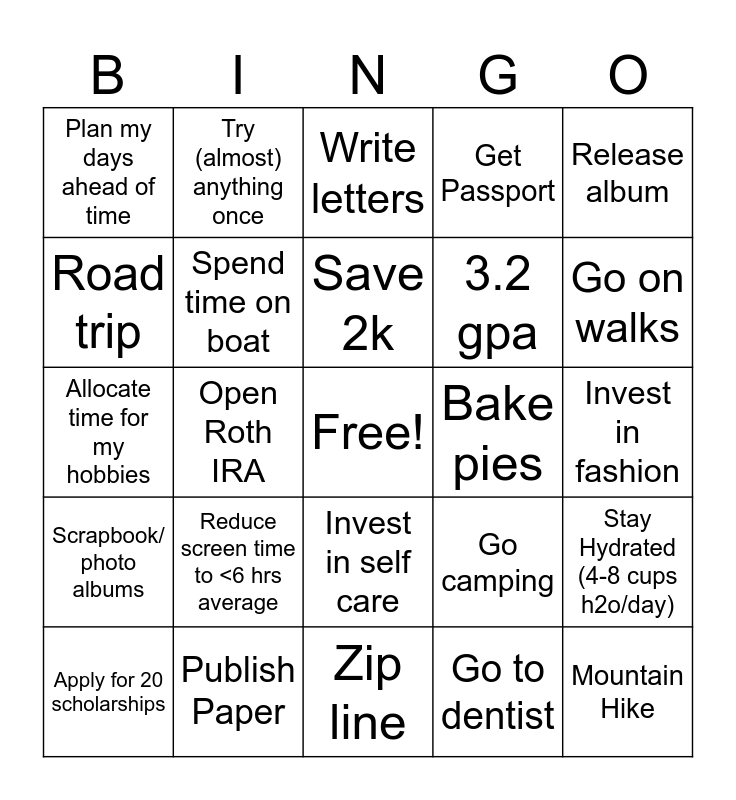 This bingo card has a free space and 24 words: Reduce screen time to <6 hrs average, Publish Paper, Save 2k, Apply for 20 scholarships, Release album, Plan my days ahead of time, Road trip, Try (almost) anything once, Bake pies, Invest in self care, 3.2 gpa, Allocate time for my hobbies, Go camping, Stay Hydrated (4-8 cups h2o/day), Spend time on boat, Go to dentist, Invest in fashion, Write letters, Go on walks, Open Roth IRA, Mountain Hike, Scrapbook/ photo albums, Get Passport and Zip line.