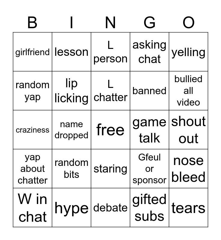 This bingo card has a free space and 24 words: random bits, hype, L chatter, W in chat, yelling, girlfriend, random yap, lesson, game talk, staring, banned, craziness, Gfeul or sponsor, nose bleed, lip licking, gifted subs, shout out, L person, bullied all video, name dropped, tears, yap about chatter, asking chat and debate.