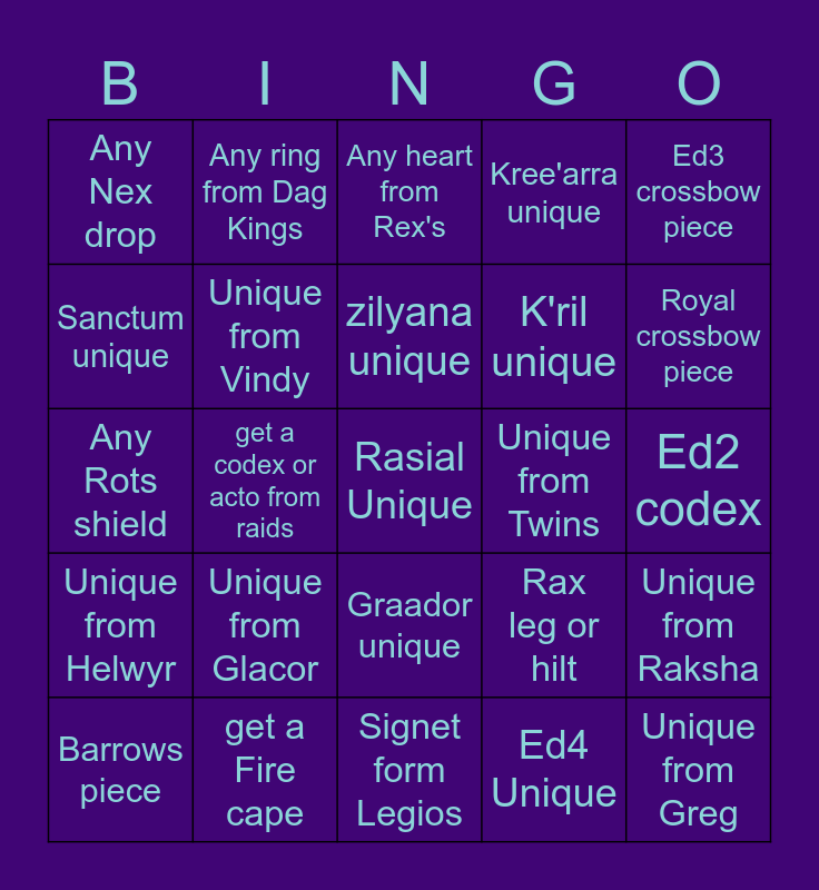 This bingo card has 25 words: Unique from Glacor, Signet form Legios, zilyana unique, Barrows piece, Ed3 crossbow piece, Any Nex drop, Sanctum unique, Any ring from Dag Kings, Unique from Twins, Graador unique, K'ril unique, Any Rots shield, Rax leg or hilt, Unique from Raksha, Unique from Vindy, Unique from Greg, Ed2 codex, Any heart from Rex's, Royal crossbow piece, get a codex or acto from raids, Rasial Unique, get a Fire cape, Unique from Helwyr, Kree'arra unique and Ed4 Unique.