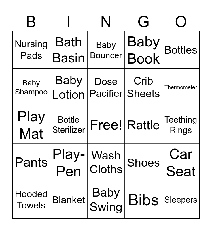 This bingo card has a free space and 48 words: Wipe Warmer, Sleepers, Breast Pumps, Baby Swing, Play-Pen, Baby Monitor, Bath Basin, Baby Socks, Baby Shampoo, Baby Body Wash, Baby Lotion, Baby Book, Car Seat, Shoes, Laundry detergent, Swaddle, Dose Pacifier, Rattle, Stuffed Animal, Bottles, Bottle Sterilizer, Bibs, Nursing Pads, Crib Sheets, Bottle Brush, Thermometer, Hooded Towels, Car Mirror, Wash Cloths, Pants, Diaper Cream, Onesie, Bottle Warmer, Stroller, Blanket, Gas Drops, Car Seat Cover, Teething Rings, Pacifiers, Pacifier Clips, Hangers, Burp Cloths, Baby Bouncer, High Chair, Play Mat, Belly Binder, Baby Powder and Nail Clippers.