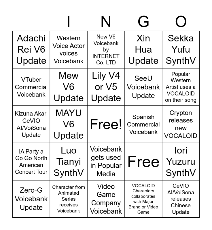 This bingo card has a free space and 25 words: Luo Tianyi SynthV, Video Game Company Voicebank, Lily V4 or V5 Update, Zero-G Voicebank Update, Sekka Yufu SynthV, Adachi Rei V6 Update, VTuber Commercial Voicebank, Western Voice Actor voices Voicebank, Spanish Commercial Voicebank, Voicebank gets used in Popular Media, SeeU Voicebank Update, Kizuna Akari CeVIO AI/VoiSona Update, Free, Iori Yuzuru SynthV, Mew V6 Update, Male CeVIO AI/VoiSona Voicebank, Crypton releases new VOCALOID, New V6 Voicebank by INTERNET Co. LTD, Popular Western Artist uses a VOCALOID on their song, MAYU V6 Update, CeVIO AI/VoiSona releases Chinese Update, Character from Animated Series receives Voicebank, IA Party a Go Go North American Concert Tour, Xin Hua Update and VOCALOID Characters collaborates with Major Brand or Video Game.
