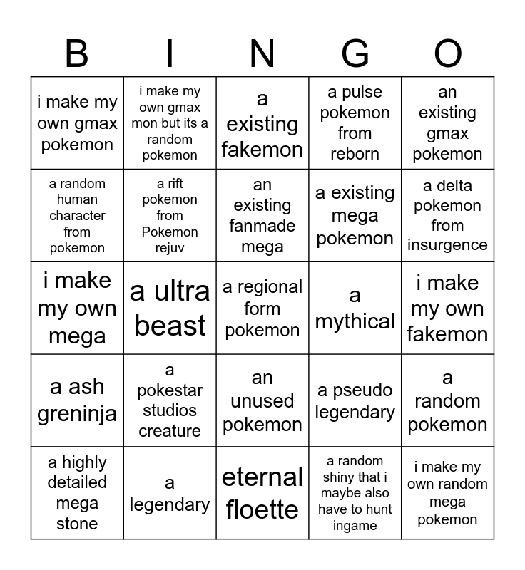 This bingo card has a free space and 24 words: a pokestar studios creature, a legendary, an existing fanmade mega, a highly detailed mega stone, an existing gmax pokemon, i make my own gmax pokemon, a random human character from pokemon, i make my own gmax mon but its a random pokemon, a mythical, an unused pokemon, a existing mega pokemon, i make my own mega, a pseudo legendary, a random pokemon, a rift pokemon from Pokemon rejuv, a random shiny that i maybe also have to hunt ingame, i make my own fakemon, a existing fakemon, a delta pokemon from insurgence, a ultra beast, i make my own random mega pokemon, a ash greninja, a pulse pokemon from reborn and eternal floette.