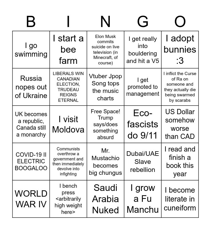 This bingo card has a free space and 24 words: Communists overthrow a government and then immediately devolve into infighting, I bench press <arbitrarily high weight here>, Vtuber Jpop Song tops the music charts, WORLD WAR IV, I adopt bunnies :3, I go swimming, Russia nopes out of Ukraine, I start a bee farm, Eco-fascists do 9/11, Mr. Mustachio becomes big chungus, I get promoted to management, UK becomes a republic, Canada still a monarchy, Dubai/UAE Slave rebellion, I read and finish a book this year, LIBERALS WIN CANADIAN ELECTION, TRUDEAU REIGNS ETERNAL, I grow a Fu Manchu, US Dollar somehow worse than CAD, Elon Musk commits suicide on live television (in Minecraft, of course), I inflict the Curse of Ra on someone and they actually die being swarmed by scarabs, I visit Moldova, I become literate in cuneiform, COVID-19 II ELECTRIC BOOGALOO, I get really into bouldering and hit a V5 and Saudi Arabia Nuked.