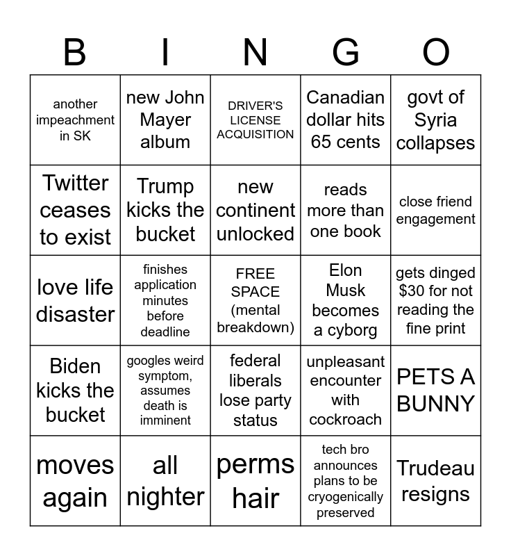 This bingo card has a free space and 24 words: googles weird symptom, assumes death is imminent, all nighter, new continent unlocked, moves again, govt of Syria collapses, another impeachment in SK, Twitter ceases to exist, new John Mayer album, Elon Musk becomes a cyborg, federal liberals lose party status, reads more than one book, love life disaster, unpleasant encounter with cockroach, PETS A BUNNY, Trump kicks the bucket, tech bro announces plans to be cryogenically preserved, gets dinged $30 for not reading the fine print, DRIVER'S LICENSE ACQUISITION, close friend engagement, finishes application minutes before deadline, Trudeau resigns, Biden kicks the bucket, Canadian dollar hits 65 cents and perms hair.