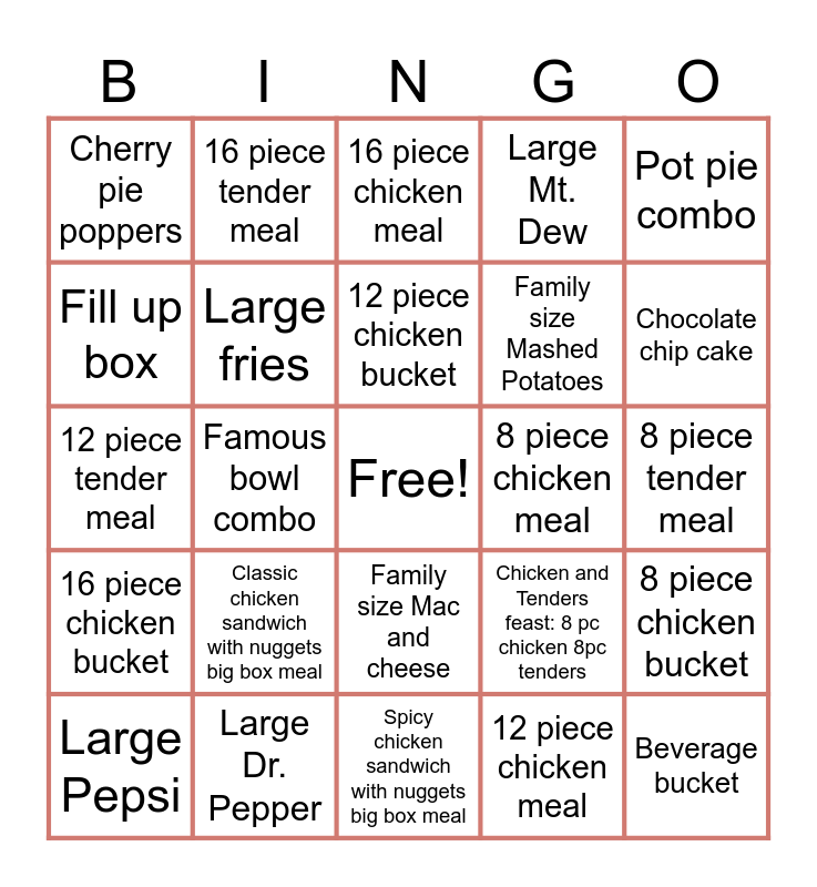 This bingo card has a free space and 24 words: Classic chicken sandwich with nuggets big box meal, Large Dr. Pepper, 12 piece chicken bucket, Large Pepsi, Pot pie combo, Cherry pie poppers, Fill up box, 16 piece tender meal, 8 piece chicken meal, Family size Mac and cheese, Family size Mashed Potatoes, 12 piece tender meal, Chicken and Tenders feast: 8 pc chicken 8pc tenders, 8 piece chicken bucket, Large fries, 12 piece chicken meal, 8 piece tender meal, 16 piece chicken meal, Chocolate chip cake, Famous bowl combo, Beverage bucket, 16 piece chicken bucket, Large Mt. Dew and Spicy chicken sandwich with nuggets big box meal.