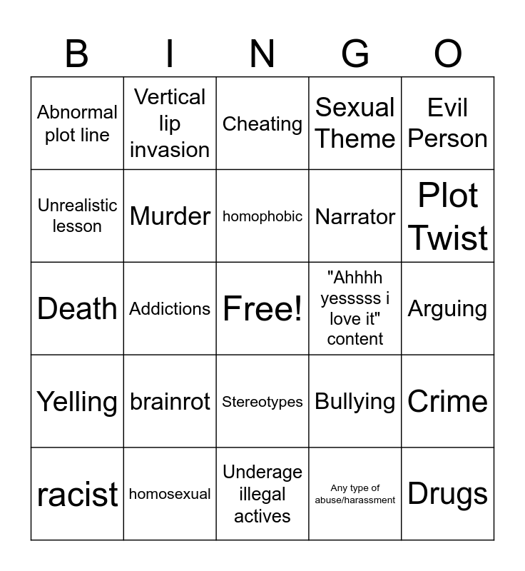 This bingo card has a free space and 24 words: brainrot, homosexual, homophobic, racist, Evil Person, Abnormal plot line, Unrealistic lesson, Vertical lip invasion, "Ahhhh yesssss i love it" content, Stereotypes, Narrator, Death, Bullying, Crime, Murder, Any type of abuse/harassment, Arguing, Cheating, Plot Twist, Addictions, Drugs, Yelling, Sexual Theme and Underage illegal actives.