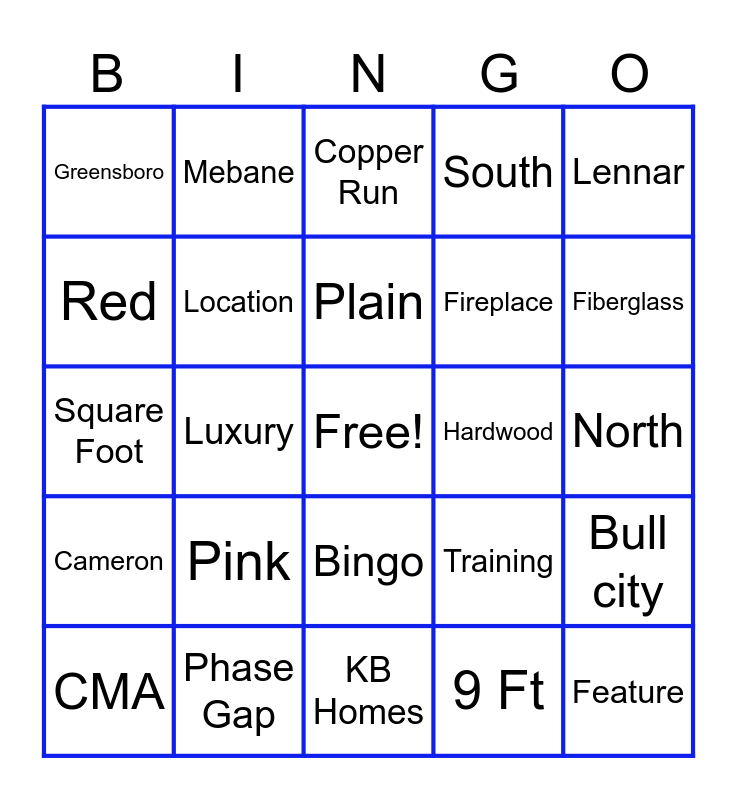 This bingo card has a free space and 24 words: Pink, Phase Gap, Plain, CMA, Lennar, Greensboro, Red, Mebane, Hardwood, Bingo, Fireplace, Square Foot, Training, Bull city, Location, 9 Ft, North, Copper Run, Fiberglass, Luxury, Feature, Cameron, South and KB Homes.