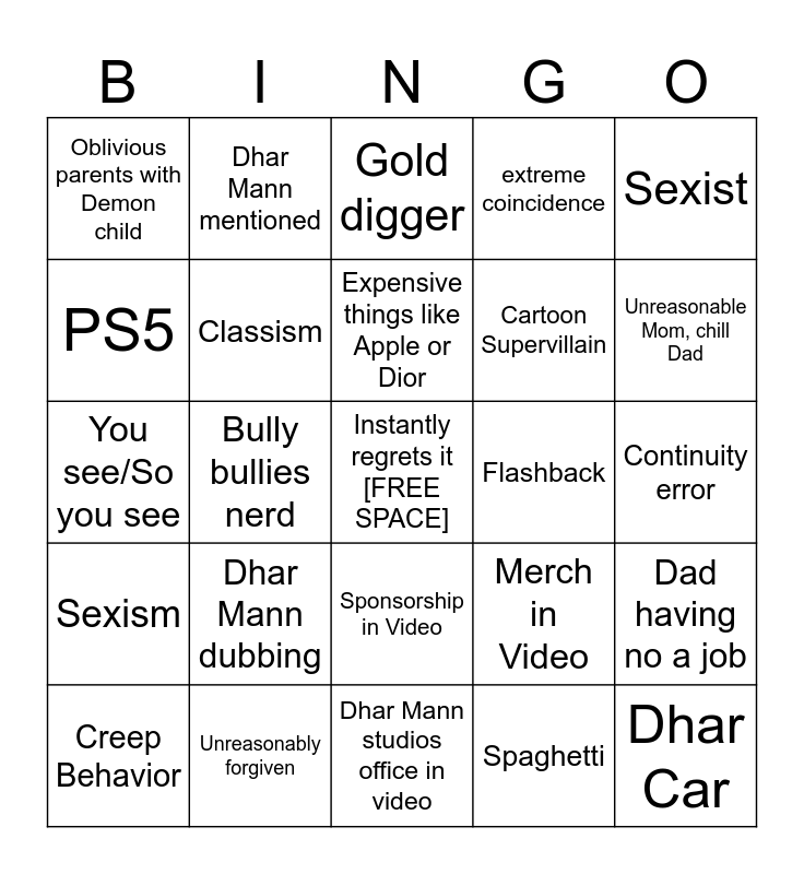 This bingo card has a free space and 34 words: Parking lot confrontation, Spaghetti, ADR, Timeskip, Sexism, Classism, Sexist, Creep Behavior, Dhar Mann mentioned, Kids with Ipad, Expensive things like Apple or Dior, Gold digger, What would happened if that happens to you, Treat people the way you want to be treated, Flashback, Unreasonable Mom, chill Dad, Unreasonably forgiven, You see/So you see, Dhar Mann dubbing, Merch in Video, Sponsorship in Video, Bad Props, Oblivious parents with Demon child, Continuity error, Dhar Mann studios office in video, Dhar Car, extreme coincidence, Someone fired over something small, Cartoon Supervillain, PS5, What happens in the dark always comes to light, Bully bullies nerd, Dad having no a job and Celebrity in video or Youtuber..
