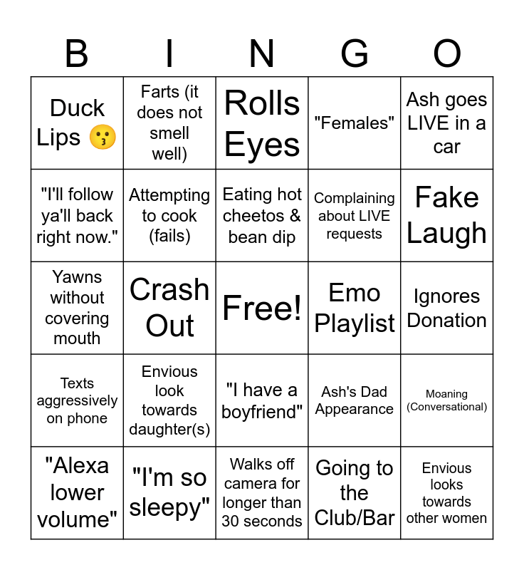 This bingo card has a free space and 90 words: I need x Galaxies, Takes credit for something she didn't do, "I have a boyfriend", Double tap that screen, Pickles on top of the fridge (open), Dos Equis, Nunu Song, M V freaking P, "Alexa play Como La Flor", Rose Toy🌹, Fiji Water, "Just kidding", Sola, sola, sola, aye, aye, aye, Ignores Donation, LV Bag, Eating hot cheetos & bean dip, Not taking accountability, Insults her kids, "If you send me a lion I'll...", Giggling over Santos, Sends herself DoorDash, Skiing with Ash ❄️, Walks off camera for longer than 30 seconds, Arching back when standing, Yawns without covering mouth, "I'm so sleepy", Burps /coughs without covering mouth, Ash sniffling, "At the end of the day", Hot cheetos & bean dip mentioned, "Thank yew", Moaning (Conversational), Tongue flick (ew), Texts aggressively on phone, Duck Lips 😗, "Females", Rolls Eyes, Pepperoni Flash (Mythic Pull), Crash Out, Fake Laugh, "Alexa lower volume", "I'll follow ya'll back right now.", Fire Heart Gift, Cops get called, Crying, Ash's Dad Appearance, Flashing / talking about her fake nails, Random BS from Amazon, Gulping Beer, "Oh, you don't know spanish.", Goomba side profile, Complaining about LIVE requests, Robot Dance (full body) 🤖, Robot Hands 🦾, Looking at herself while on the phone, Lotion on the rings, Emo Playlist, Failed kiss attempt, Jefa appears (unwanted), Mods???, Touching her water balloons, Loses "friends", Shawty Bae mention, Double Peace Signs ✌️, Calls Santos, Hair Extensions, "This is why I don't have female friends.", Going to the Club/Bar, Wingstop 🍗, Eating meat with her fingers, Envious look towards daughter(s), Envious looks towards other women, Bragging about money, "My daughters have a bed you guys.", Farts (it does not smell well), Attempting to cook (fails), Insincere Apology, "I'm blocking them", Deflated Lips, "Work together you guys.", "Tap, tap, tap.", Ash goes LIVE in a car, Phone dies while on LIVE, Gets defensive towards appearance / makeup, "My daughters are taken care of.", Accent Change, Battling Santos, Battling Jefa, "They're just jealous." and Frog booty.