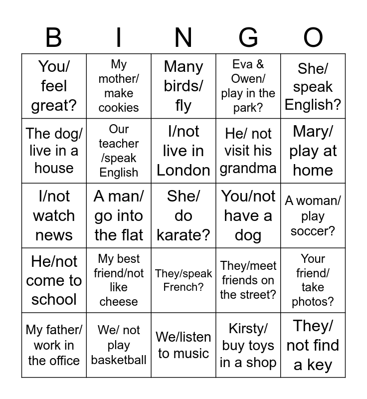 This bingo card has 25 words: My best friend/not like cheese, We/listen to music, I/not live in London, My father/ work in the office, She/ speak English?, You/ feel great?, The dog/ live in a house, My mother/ make cookies, You/not have a dog, They/speak French?, He/ not visit his grandma, I/not watch news, They/meet friends on the street?, Your friend/ take photos?, Our teacher /speak English, They/ not find a key, A woman/ play soccer?, Many birds/ fly, Mary/ play at home, A man/ go into the flat, She/ do karate?, We/ not play basketball, He/not come to school, Eva & Owen/ play in the park? and Kirsty/ buy toys in a shop.
