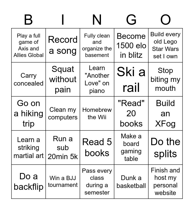 This bingo card has 25 words: Run a sub 20min 5k, Pass every class during a semester, Learn "Another Love" on piano, Do a backflip, Build every old Lego Star Wars set I own, Play a full game of Axis and Allies Global, Carry concealed, Record a song, "Read" 20 books, Read 5 books, Ski a rail, Go on a hiking trip, Make a board gaming table, Do the splits, Squat without pain, Finish and host my personal website, Build an XFog, Fully clean and organize the basement, Stop biting my mouth, Clean my computers, Homebrew the Wii, Win a BJJ tournament, Learn a striking martial art, Become 1500 elo in blitz and Dunk a basketball.
