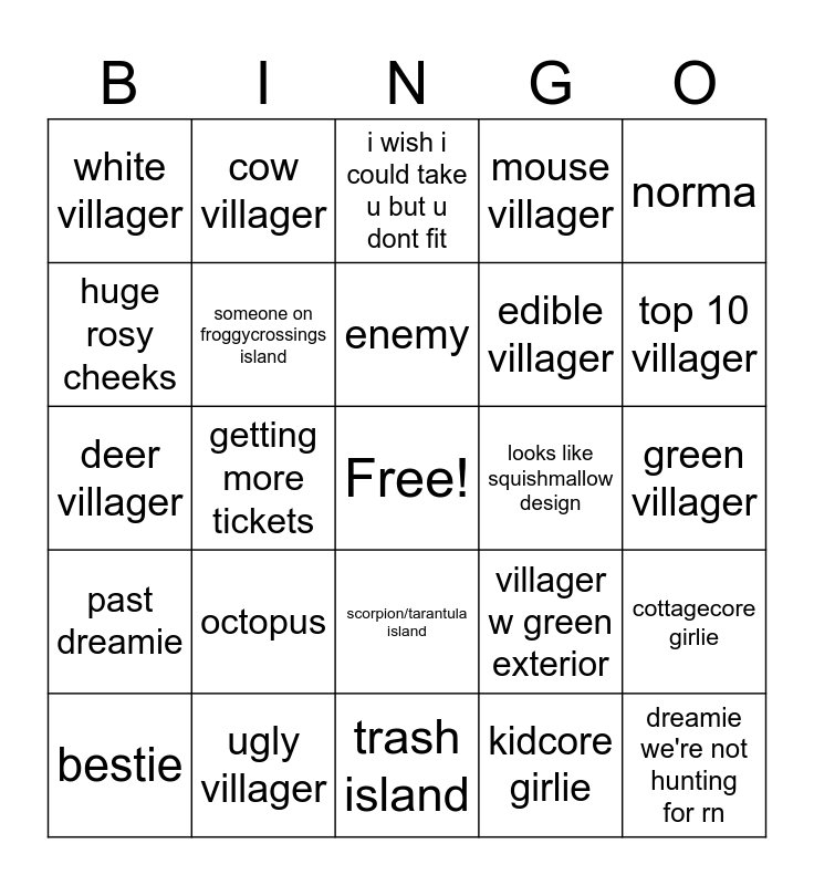 This bingo card has a free space and 24 words: octopus, ugly villager, enemy, bestie, norma, white villager, huge rosy cheeks, cow villager, looks like squishmallow design, scorpion/tarantula island, edible villager, deer villager, villager w green exterior, cottagecore girlie, someone on froggycrossings island, kidcore girlie, green villager, i wish i could take u but u dont fit, top 10 villager, getting more tickets, dreamie we're not hunting for rn, past dreamie, mouse villager and trash island.