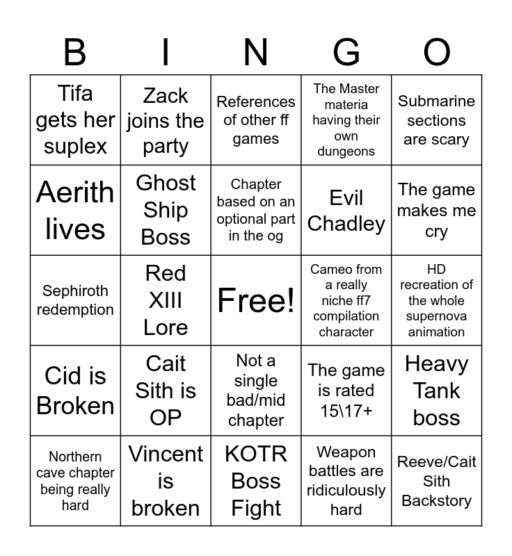 This bingo card has a free space and 24 words: Cait Sith is OP, Vincent is broken, Chapter based on an optional part in the og, Northern cave chapter being really hard, Submarine sections are scary, Tifa gets her suplex, Aerith lives, Zack joins the party, Cameo from a really niche ff7 compilation character, Not a single bad/mid chapter, Evil Chadley, Sephiroth redemption, The game is rated 15\17+, Heavy Tank boss, Ghost Ship Boss, Weapon battles are ridiculously hard, HD recreation of the whole supernova animation, References of other ff games, The game makes me cry, Red XIII Lore, Reeve/Cait Sith Backstory, Cid is Broken, The Master materia having their own dungeons and KOTR Boss Fight.