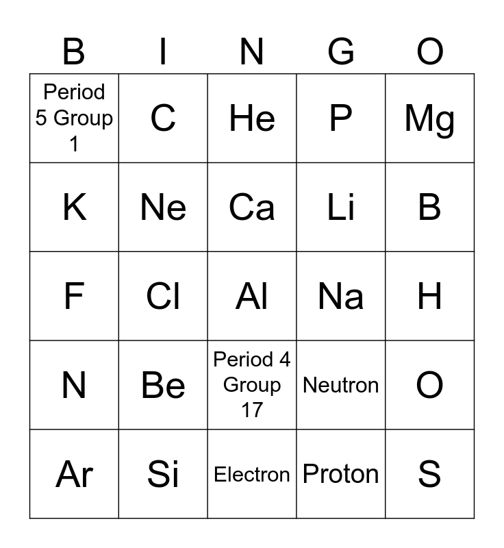 This bingo card has 25 words: Be, Electron, Ca, Ar, Mg, Period 5 Group 1, K, C, Na, Period 4 Group 17, Li, F, Neutron, O, Ne, S, H, He, B, Cl, Al, Si, N, P and Proton.
