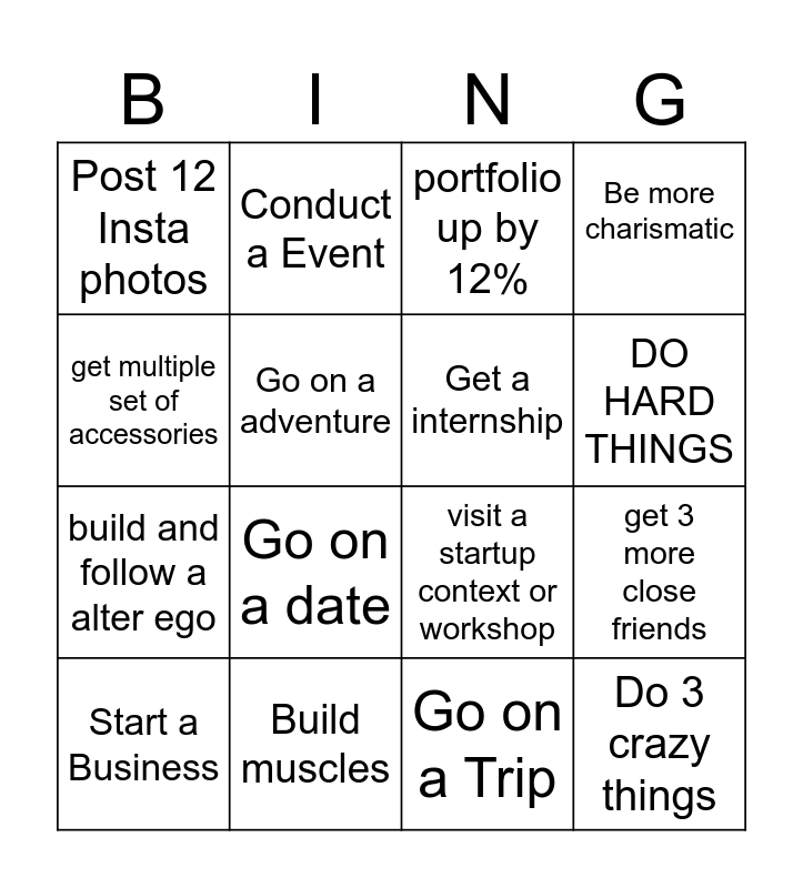 This bingo card has 17 words: Go on a Trip, Start a Business, portfolio up by 12%, Post 12 Insta photos, Go on a date, Be more charismatic, get 3 more close friends, Get a internship, DO HARD THINGS, Go on a adventure, Build muscles, visit a startup context or workshop, get multiple set of accessories, Conduct a Event, build and follow a alter ego, post Youtube and Instagram content and Do 3 crazy things.