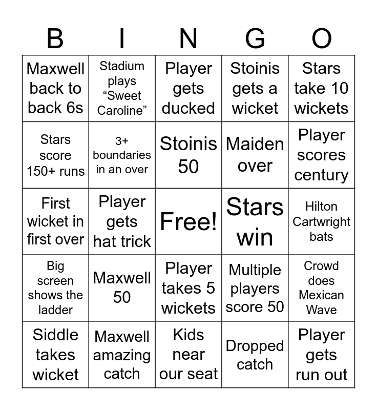 This bingo card has a free space and 24 words: Maxwell 50, Maxwell amazing catch, Stoinis 50, Siddle takes wicket, Stars take 10 wickets, Maxwell back to back 6s, Stars score 150+ runs, Stadium plays “Sweet Caroline”, Stars win, Player takes 5 wickets, Maiden over, First wicket in first over, Multiple players score 50, Crowd does Mexican Wave, 3+ boundaries in an over, Dropped catch, Hilton Cartwright bats, Player gets ducked, Player scores century, Player gets hat trick, Player gets run out, Big screen shows the ladder, Stoinis gets a wicket and Kids near our seat.