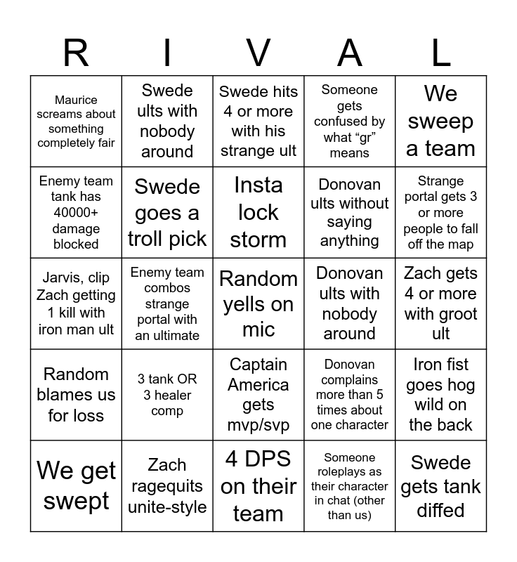 This bingo card has 25 words: 3 tank OR 3 healer comp, 4 DPS on their team, Insta lock storm, We get swept, We sweep a team, Maurice screams about something completely fair, Enemy team tank has 40000+ damage blocked, Swede ults with nobody around, Donovan ults with nobody around, Captain America gets mvp/svp, Donovan ults without saying anything, Jarvis, clip Zach getting 1 kill with iron man ult, Donovan complains more than 5 times about one character, Iron fist goes hog wild on the back, Swede goes a troll pick, Swede gets tank diffed, Zach gets 4 or more with groot ult, Swede hits 4 or more with his strange ult, Strange portal gets 3 or more people to fall off the map, Enemy team combos strange portal with an ultimate, Random yells on mic, Zach ragequits unite-style, Random blames us for loss, Someone gets confused by what “gr” means and Someone roleplays as their character in chat (other than us).