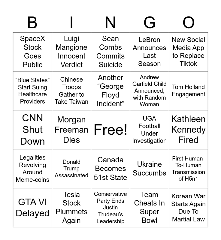 This bingo card has a free space and 24 words: Donald Trump Assassinated, Tesla Stock Plummets Again, Another “George Floyd Incident”, GTA VI Delayed, New Social Media App to Replace Tiktok, SpaceX Stock Goes Public, “Blue States” Start Suing Healthcare Providers, Luigi Mangione Innocent Verdict, UGA Football Under Investigation, Canada Becomes 51st State, Andrew Garfield Child Announced, with Random Woman, CNN Shut Down, Ukraine Succumbs, First Human-To-Human Transmission of H5n1, Chinese Troops Gather to Take Taiwan, Team Cheats In Super Bowl, Kathleen Kennedy Fired, Sean Combs Commits Suicide, Tom Holland Engagement, Morgan Freeman Dies, Korean War Starts Again Due To Martial Law, Legalities Revolving Around Meme-coins, LeBron Announces Last Season and Conservative Party Ends Justin Trudeau’s Leadership.