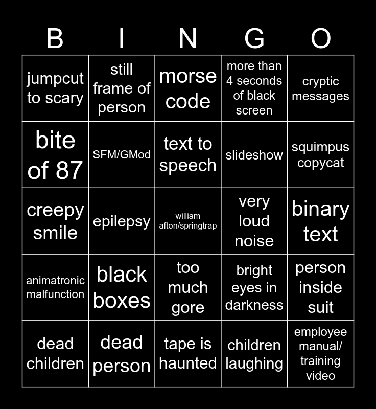 This bingo card has a free space and 24 words: black boxes, dead person, text to speech, dead children, cryptic messages, jumpcut to scary, bite of 87, still frame of person, very loud noise, too much gore, slideshow, creepy smile, bright eyes in darkness, person inside suit, SFM/GMod, children laughing, binary text, morse code, squimpus copycat, epilepsy, employee manual/ training video, animatronic malfunction, more than 4 seconds of black screen and tape is haunted.
