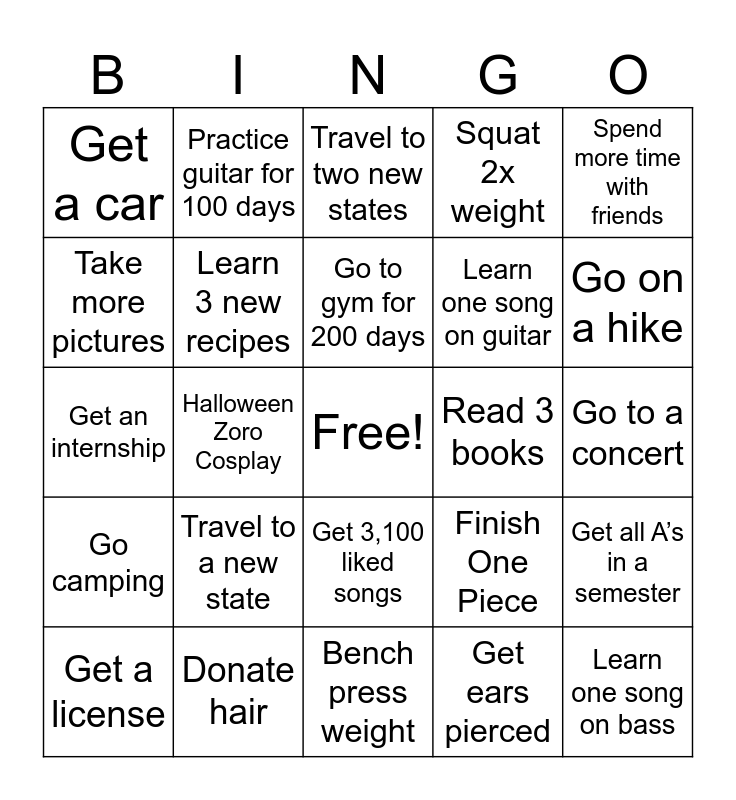 This bingo card has a free space and 24 words: Get a license, Travel to a new state, Go to gym for 200 days, Get ears pierced, Spend more time with friends, Get a car, Practice guitar for 100 days, Travel to two new states, Read 3 books, Go to a concert, Get an internship, Learn 3 new recipes, Finish One Piece, Get all A’s in a semester, Take more pictures, Donate hair, Bench press weight, Squat 2x weight, Go on a hike, Go camping, Halloween Zoro Cosplay, Get 3,100 liked songs, Learn one song on guitar and Learn one song on bass.