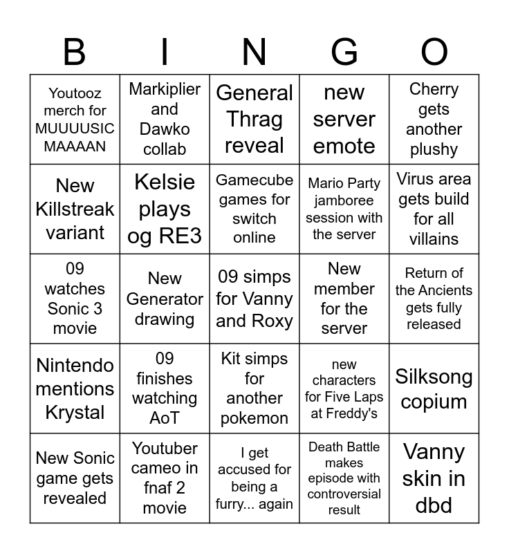 This bingo card has a free space and 24 words: 09 finishes watching AoT, Youtuber cameo in fnaf 2 movie, Gamecube games for switch online, New Sonic game gets revealed, Cherry gets another plushy, Youtooz merch for MUUUUSIC MAAAAN, New Killstreak variant, Markiplier and Dawko collab, New member for the server, Kit simps for another pokemon, Mario Party jamboree session with the server, 09 watches Sonic 3 movie, new characters for Five Laps at Freddy's, Silksong copium, Kelsie plays og RE3, Death Battle makes episode with controversial result, Return of the Ancients gets fully released, General Thrag reveal, Virus area gets build for all villains, New Generator drawing, Vanny skin in dbd, Nintendo mentions Krystal, new server emote and I get accused for being a furry... again.