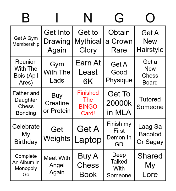 This bingo card has a free space and 24 words: Get Weights, Meet With Angel Again, Earn At Least 6K, Complete An Album in Monopoly Go, Get A New Hairstyle, Get A Gym Membership, Reunion With The Bois (Apil Ares), Get Into Drawing Again, Get To 20000k in MLA, Get A Laptop, Get A Good Physique, Father and Daughter Chess Bonding, Finish my First Demon In GD, Laag Sa Bacolod Or Sagay, Gym With The Lads, Deep Talked With Someone, Tutored Someone, Get to Mythical Glory, Get a New Chess Board, Buy Creatine or Protein, Shared My Lore, Celebrate My Birthday, Obtain a Crown Rare and Buy A Chess Book.