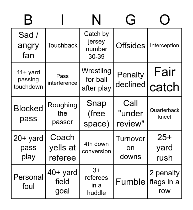 This bingo card has a free space and 43 words: Booing at referee, Roughing the passer, Celebratory helmet slap, Fumble, False start, Personal foul, Pass interference, Injury timeout, Offsides, Quarterback sack, Sad / angry fan, Coach yells at referee, Turnover on downs, 25+ yard rush, Diving catch, 5+ yard running touchdown, Kickoff return 30+ yards, Call "under review", Missed field goal, Blocked pass, Touchback, Touchdown victory dance, Player takes a drink, Interception, Challenge, 40+ yard field goal, 4th down conversion, 50+ combined score, 2 penalty flags in a row, 20+ yard pass play, 1st down conversion, Wrestling for ball after play, Icing the kicker, Quarterback kneel, 2-point conversion, One-handed catch, 3+ referees in a huddle, Penalty declined, Fair catch, 11+ yard passing touchdown, Quarterback running gain, Catch by jersey number 30-39 and Skycam footage during play.
