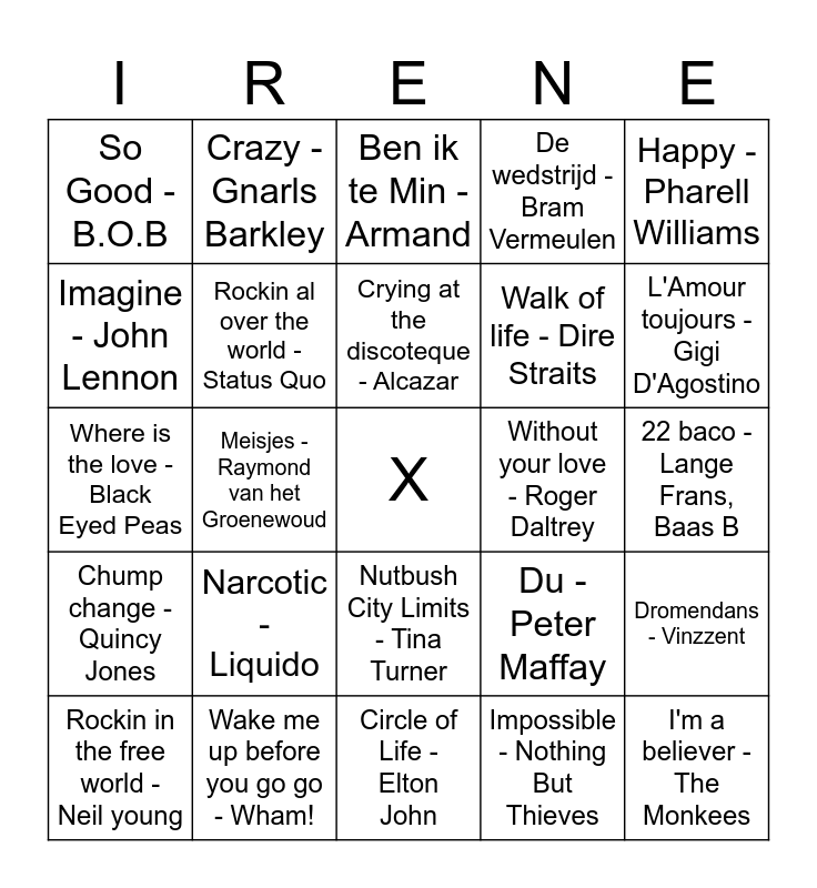This bingo card has a free space and 70 words: Laat de Zon in Je Hart - René Schuurman, 22 baco - Lange Frans, Baas B, Last Christmas - Wham!, Crazy - Seal, Wake me up before you go go - Wham!, Fire ball - Pitbull, De wedstrijd - Bram Vermeulen, Noodgeval - Goldband, Happy - Pharell Williams, House of Rising Sun - Animals, Dromendans - Vinzzent, Adrenaline - Kris Kross Amsterdam, Ronnie Flex, So Good - B.O.B, Ben ik te Min - Armand, Your song - Elton John, Meisjes - Raymond van het Groenewoud, Nutbush City Limits - Tina Turner, Walk of life - Dire Straits, After midnight - JJ Cale, Chump change - Quincy Jones, Without your love - Roger Daltrey, Du - Peter Maffay, L'Amour toujours - Gigi D'Agostino, Rock the Nation - Michael Franti, Me Rahúso - Danny Ocean, FE!N - Travis Scott, Street Spirit - Radiohead, Don't you want me - The Human League, Impossible - Nothing But Thieves, Rosanne - Nick en Simon, Crazy - Gnarls Barkley, Terug in de tijd - Yves Berendse, Dancing Queen - Abba, What a feeling - Irene Cara, Is she really going out with him - Joe Jackson, De Beer - Hetty Blok en Leen Jongewaard, Ayo technology - Milow, Jump - Kris Kros, Shape of you - Ed Sheeran, Imagine - John Lennon, De Manier - Kraantje Pappie, Narcotic - Liquido, I'm a believer - The Monkees, Wake me up - Avici, Disco Inferno - The Tramps, Rockin al over the world - Status Quo, Rockin in the free world - Neil young, Total eclipse of my heart - Bonny Tyler, Calypso - John Denver, Ratata - La Fuente, I Was Made For Lovin’ You - KISS, Blinding lights - The Weeknd, Blikkendag - Sven Versteegh, Likke Pêhp, Losse pols - Donnie, Circle of Life - Elton John, Gimme! Gimme! Gimme! - ABBA, Crying at the discoteque - Alcazar, Dancing in the moonlight - Toploader, Grace Kelly - Mika, Unwritten - Natasha Beddingfield, Where is the love - Black Eyed Peas, Don't go breaking my heart - Elton John, Watermelon Sugar - Harry Styles, Dog Days Are Over - Florence + The Machine, Waterfalls - TLC, Cheerleader - OMI, Mr. Brightside - The Killers, I'm so excited - Pointer Sisters, I'm coming out - Diana Ross and Uptown Funk - Bruno Mars.