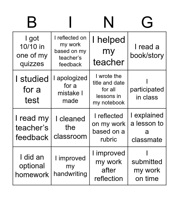 This bingo card has 16 words: I improved my handwriting, I explained a lesson to a classmate, I helped my teacher, I got 10/10 in one of my quizzes, I read my teacher’s feedback, I reflected on my work based on my teacher’s feedback, I reflected on my work based on a rubric, I improved my work after reflection, I studied for a test, I apologized for a mistake I made, I did an optional homework, I read a book/story, I cleaned the classroom, I participated in class, I wrote the title and date for all lessons in my notebook and I submitted my work on time.