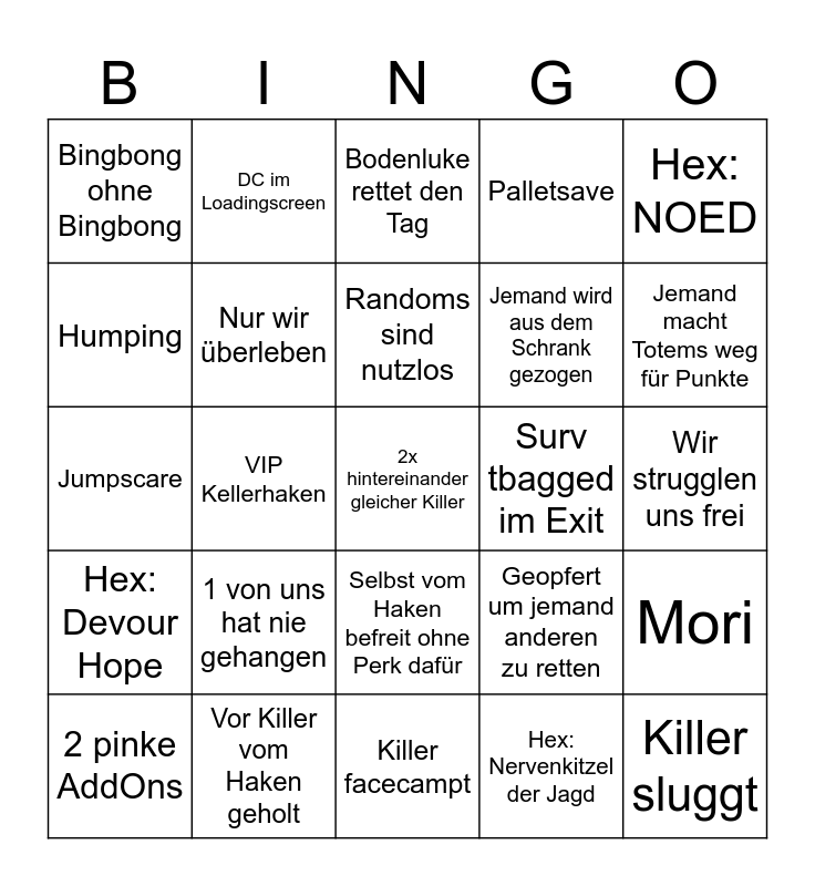 This bingo card has 25 words: 1 von uns hat nie gehangen, Killer facecampt, Randoms sind nutzlos, 2 pinke AddOns, Hex: NOED, Bingbong ohne Bingbong, Humping, DC im Loadingscreen, Surv tbagged im Exit, Selbst vom Haken befreit ohne Perk dafür, Jemand wird aus dem Schrank gezogen, Jumpscare, Geopfert um jemand anderen zu retten, Mori, Nur wir überleben, Killer sluggt, Wir strugglen uns frei, Bodenluke rettet den Tag, Jemand macht Totems weg für Punkte, VIP Kellerhaken, 2x hintereinander gleicher Killer, Vor Killer vom Haken geholt, Hex: Devour Hope, Palletsave and Hex: Nervenkitzel der Jagd.