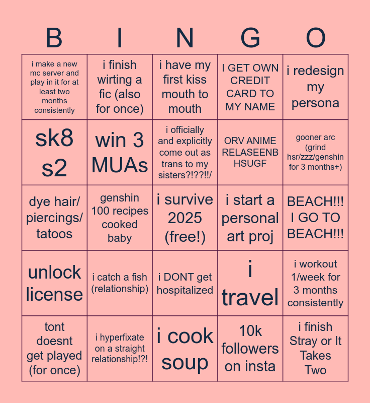 This bingo card has a free space and 24 words: i catch a fish (relationship), i hyperfixate on a straight relationship!?!, i officially and explicitly come out as trans to my sisters?!??!!/, tont doesnt get played (for once), i redesign my persona, i make a new mc server and play in it for at least two months consistently, sk8 s2, i finish wirting a fic (also for once), i start a personal art proj, i DONT get hospitalized, ORV ANIME RELASEENB HSUGF, dye hair/ piercings/ tatoos, i travel, i workout 1/week for 3 months consistently, win 3 MUAs, 10k followers on insta, BEACH!!! I GO TO BEACH!!!, i have my first kiss mouth to mouth, gooner arc (grind hsr/zzz/genshin for 3 months+), genshin 100 recipes cooked baby, i finish Stray or It Takes Two, unlock license, I GET OWN CREDIT CARD TO MY NAME and i cook soup.