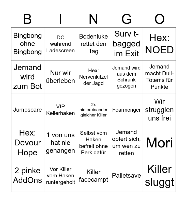 This bingo card has 25 words: 1 von uns hat nie gehangen, Killer facecampt, Hex: Nervenkitzel der Jagd, 2 pinke AddOns, Hex: NOED, Bingbong ohne Bingbong, Jemand wird zum Bot, DC während Ladescreen, Fearmonger, Selbst vom Haken befreit ohne Perk dafür, Jemand wird aus dem Schrank gezogen, Jumpscare, Jemand opfert sich, um wen zu retten, Mori, Nur wir überleben, Killer sluggt, Wir strugglen uns frei, Bodenluke rettet den Tag, Jemand macht Dull-Totems für Punkte, VIP Kellerhaken, 2x hintereinander gleicher Killer, Vor Killer vom Haken runtergeholt, Hex: Devour Hope, Surv t-bagged im Exit and Palletsave.