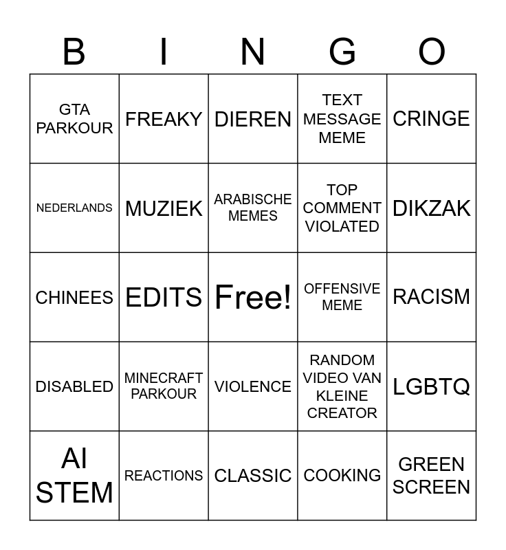 This bingo card has a free space and 24 words: AI STEM, MINECRAFT PARKOUR, ARABISCHE MEMES, COOKING, CRINGE, GTA PARKOUR, FREAKY, DIEREN, OFFENSIVE MEME, RACISM, CHINEES, MUZIEK, RANDOM VIDEO VAN KLEINE CREATOR, LGBTQ, NEDERLANDS, REACTIONS, CLASSIC, TEXT MESSAGE MEME, DIKZAK, DISABLED, EDITS, VIOLENCE, TOP COMMENT VIOLATED and GREEN SCREEN.