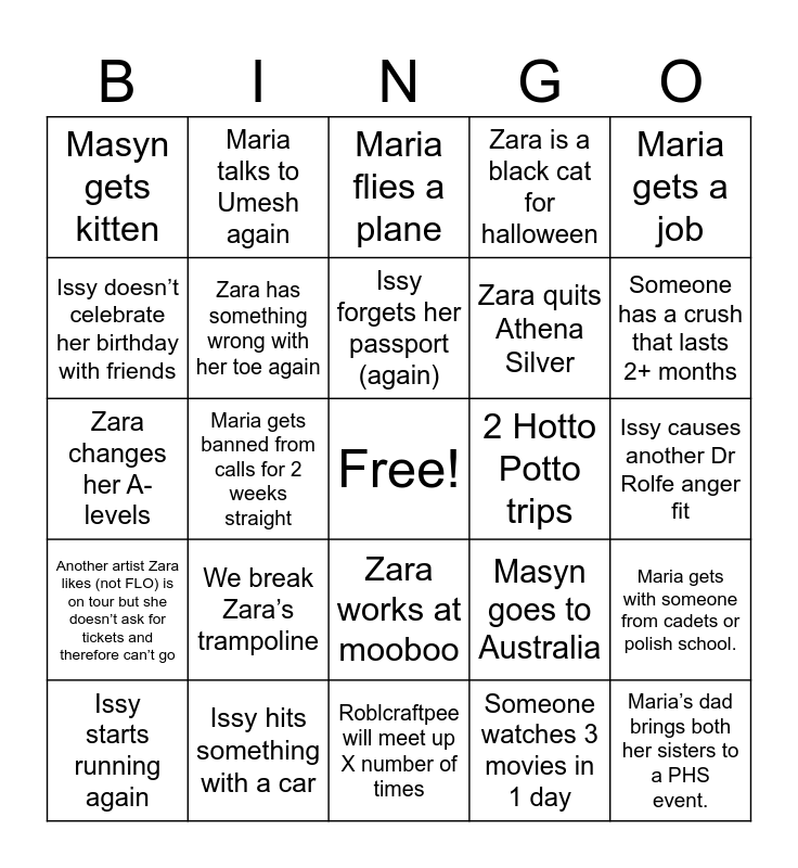 This bingo card has a free space and 48 words: Zara gets food poisoning, Maria’s dad brings both her sisters to a PHS event., Issy gets an 8 and her dad is mad about it, Roblcraftpee will meet up X number of times, We break Zara’s trampoline, Nina Bibs disappears for 2+ weeks straight, Maria talks to Umesh again, Zara goes on 2 dates with same person, Issy doesn’t celebrate her birthday with friends, Issy kisses a King’s boy, Zara has something wrong with her toe again, Zara is a black cat for halloween, Maria gets with someone from cadets or polish school., Masyn goes to Australia, Masyn dates a ‘straight’ guy, Masyn doesn’t get driver’s license, Issy forgets her passport (again), 2 Hotto Potto trips, Zara destroys her phone, Maria gets a job, Maria gets banned from calls for 2 weeks straight, Someone watches 3 movies in 1 day, Masyn gets kitten, Zara quits Athena Silver, Masyn’s fortnite playtime goes above 300hrs, Someone has a crush that lasts 2+ months, Issy starts running again, 3 German students get a 5, Zara works at mooboo, Another artist Zara likes (not FLO) is on tour but she doesn’t ask for tickets and therefore can’t go, Someone in Y11 gets a 3, Masyn starts revising for GCSEs 2 weeks before (or closer), Masyn celebrates Christmas on a random day in December again, Issy leaves 3+ days after school ends (unlikely), Issy hits something with a car, Maria’s bike breaks, Masyn’s 3D printer breaks, Issy causes another Dr Rolfe anger fit, Issy has another scary tree dream, Issy breaks vow of sobriety, Ewan gets kicked out of Tiffin (and joins Masyn at Graveney), Issy goes to the Philippines, Maria flies a plane, Maria gets 1 mark away from grade above in 2+ GCSEs, Zara changes her A-levels, Masyn gets banned from Roblox (by Roblox), Maria quits rowing and Issy goes to 3 concerts.