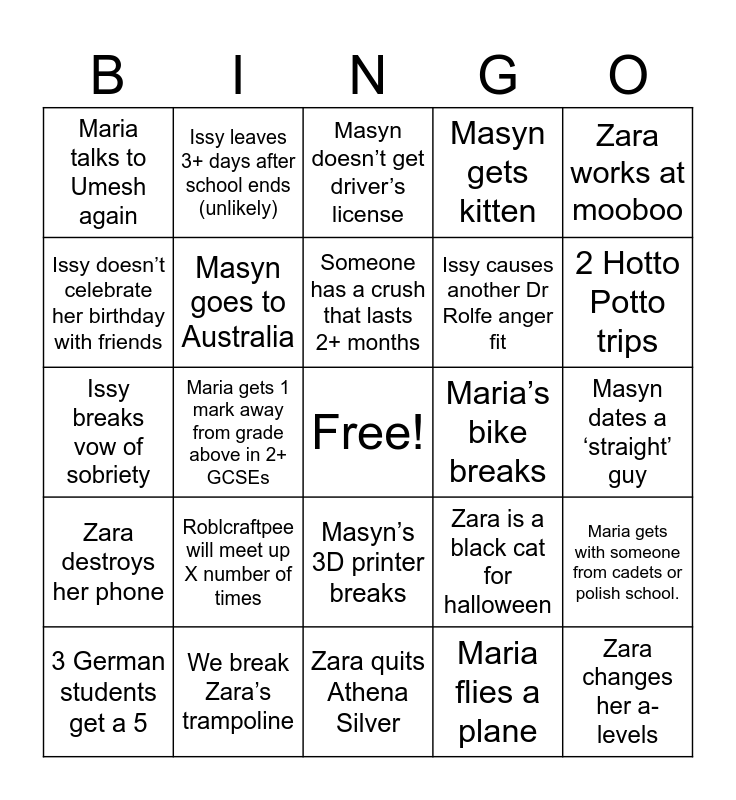 This bingo card has a free space and 24 words: Roblcraftpee will meet up X number of times, We break Zara’s trampoline, Someone has a crush that lasts 2+ months, 3 German students get a 5, Zara works at mooboo, Maria talks to Umesh again, Issy doesn’t celebrate her birthday with friends, Issy leaves 3+ days after school ends (unlikely), Maria’s bike breaks, Masyn’s 3D printer breaks, Issy causes another Dr Rolfe anger fit, Issy breaks vow of sobriety, Zara is a black cat for halloween, Maria gets with someone from cadets or polish school., Masyn goes to Australia, Maria flies a plane, Masyn dates a ‘straight’ guy, Masyn doesn’t get driver’s license, 2 Hotto Potto trips, Maria gets 1 mark away from grade above in 2+ GCSEs, Zara changes her a-levels, Zara destroys her phone, Masyn gets kitten and Zara quits Athena Silver.
