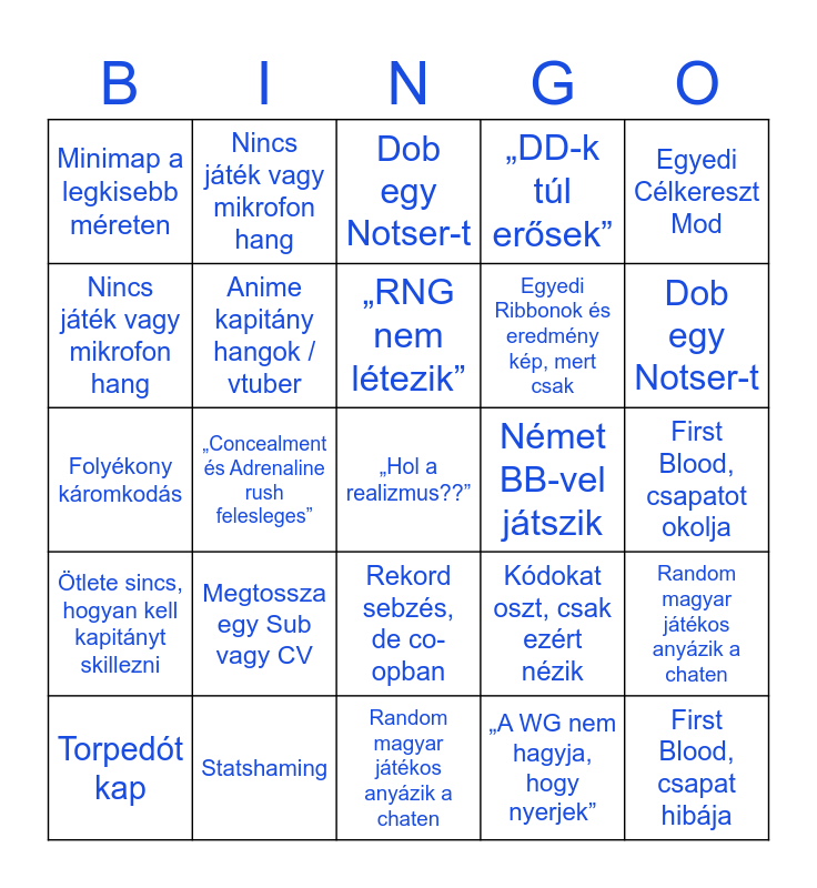This bingo card has 40 words: Legalább 3 mod ami elfoglalja a képernyő egy részét, Folyékony káromkodás, 50% WR alatti, Anime kapitány hangok / vtuber, Statshaming, Rekord sebzés, de co-opban, „RNG nem létezik”, „Noobshield”, Egyedi Célkereszt Mod, Ötlete sincs, hogyan kell kapitányt skillezni, „Concealment és Adrenaline rush felesleges”, „DD-k túl erősek”, „Hol a realizmus??”, First Blood, csapatot okolja, Német BB-vel játszik, Megtossza egy Sub vagy CV, Torpedót kap, Minimap a legkisebb méreten, Kódokat oszt, csak ezért nézik, Dob egy Notser-t, Random magyar játékos anyázik a chaten, „A WG nem hagyja, hogy nyerjek”, Egyedi Ribbonok és eredmény kép, mert csak, Nincs játék vagy mikrofon hang, Stream véget ér egy dühkitörés után, „Concealment és Adrenaline rush felesleges”, „DD-k túl erősek”, „Hol a realizmus??”, First Blood, csapat hibája, Német BB-vel játszik, Megtossza egy Sub vagy CV, Torpedót kap, Minimap a legkisebb méreten, Kódokat oszt, csak ezért nézik, Dob egy Notser-t, Random magyar játékos anyázik a chaten, „A WG nem hagyja, hogy nyerjek”, Egyedi Ribbonok és eredmény kép, mert csak, Nincs játék vagy mikrofon hang and Stream véget ér egy dühkitörés után.