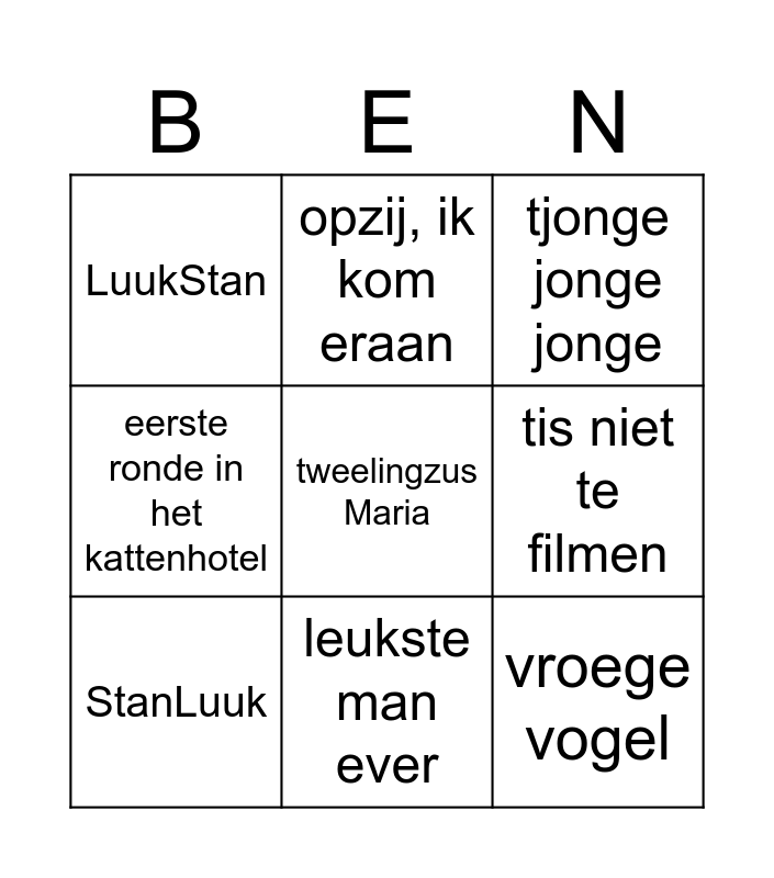 This bingo card has a free space and 8 words: tis niet te filmen, tjonge jonge jonge, opzij, ik kom eraan, StanLuuk, LuukStan, vroege vogel, eerste ronde in het kattenhotel and leukste man ever.
