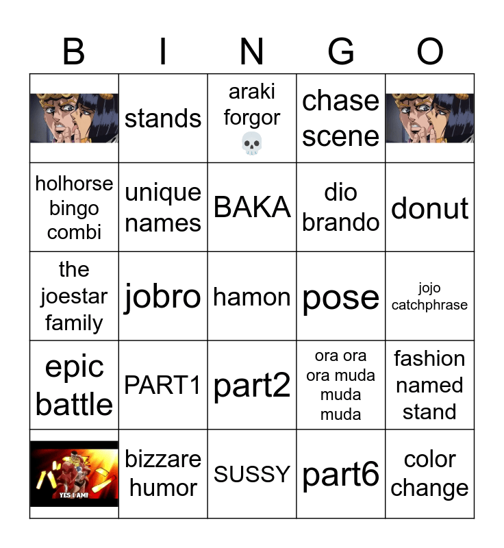 This bingo card has 3 images and 22 words: PART1, SUSSY, BAKA, holhorse bingo combi, stands, pose, part2, dio brando, the joestar family, ora ora ora muda muda muda, fashion named stand, unique names, color change, jojo catchphrase, araki forgor💀, donut, jobro, hamon, bizzare humor, epic battle, chase scene and part6.