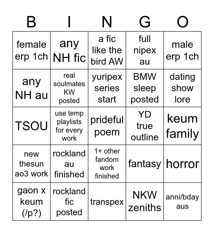 This bingo card has a free space and 24 words: rockland au finished, rockland fic posted, yuripex series start, gaon x keum (/p?), male erp 1ch, female erp 1ch, any NH au, any NH fic, YD true outline, 1+ other fandom work finished, BMW sleep posted, TSOU, fantasy, horror, real soulmates KW posted, NKW zeniths, keum family, a fic like the bird AW, dating show lore, use temp playlists for every work, anni/bday aus, new thesun ao3 work, full nipex au and transpex.