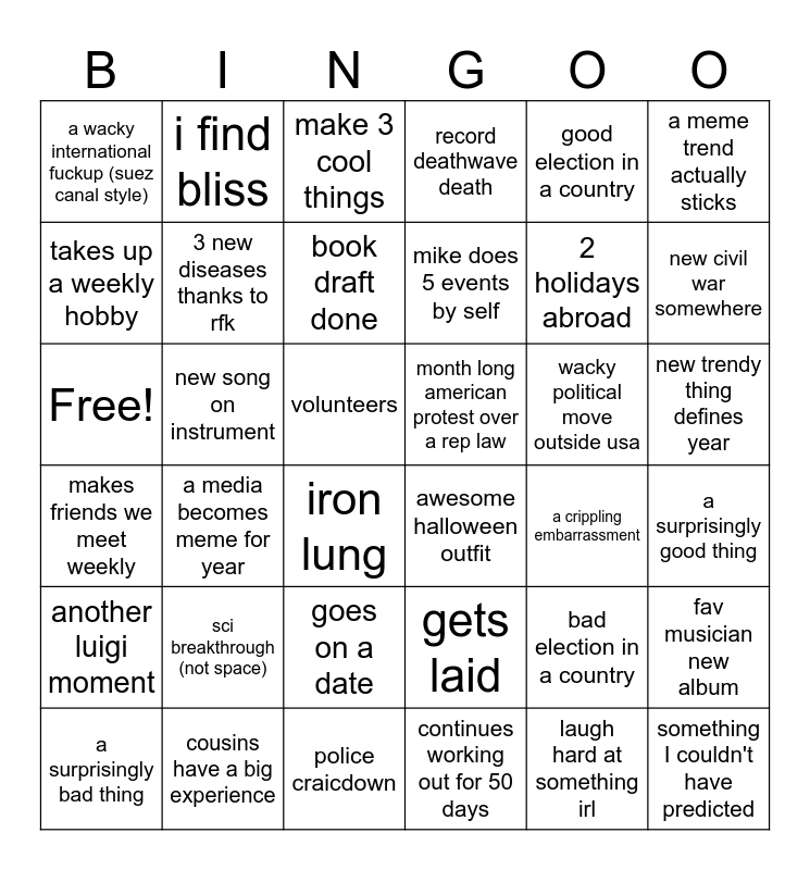 This bingo card has 36 words: gets laid, goes on a date, continues working out for 50 days, takes up a weekly hobby, makes friends we meet weekly, month long american protest over a rep law, 3 new diseases thanks to rfk, police craicdown, good election in a country, bad election in a country, new civil war somewhere, record deathwave death, fav musician new album, new song on instrument, mike does 5 events by self, a wacky international fuckup (suez canal style), another luigi moment, wacky political move outside usa, Free!, make 3 cool things, volunteers, a media becomes meme for year, awesome halloween outfit, iron lung, a crippling embarrassment, i find bliss, 2 holidays abroad, cousins have a big experience, book draft done, a meme trend actually sticks, something I couldn't have predicted, a surprisingly bad thing, a surprisingly good thing, new trendy thing defines year, sci breakthrough (not space) and laugh hard at something irl.
