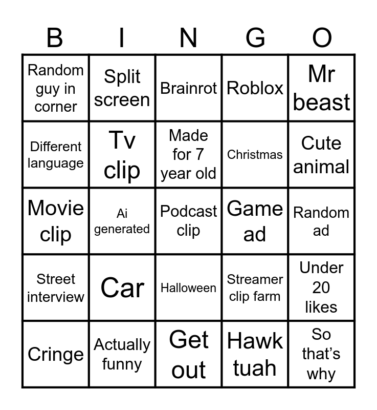 This bingo card has a free space and 24 words: Cringe, Car, Made for 7 year old, Hawk tuah, Mr beast, Random guy in corner, Split screen, Brainrot, Game ad, Random ad, Movie clip, Tv clip, Streamer clip farm, Under 20 likes, Different language, Actually funny, Get out, Roblox, Cute animal, Street interview, Ai generated, Halloween, Christmas and So that’s why.