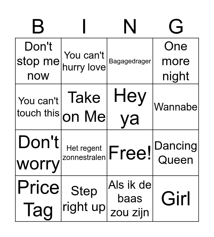 This bingo card has a free space and 19 words: Girl, Oops, I did it again, Bagagedrager, Girls just wanna have fun, Dancing Queen, You can't touch this, Als ik de baas zou zijn, Don't stop me now, You can't hurry love, Don't worry, Het regent zonnestralen, Take on Me, Hey ya, Step right up, Price Tag, Ai se eu te pego, One more night, Wannabe and I'm a believer.
