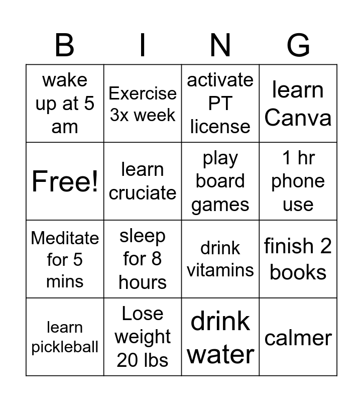 This bingo card has 16 words: Lose weight 20 lbs, finish 2 books, activate PT license, wake up at 5 am, Meditate for 5 mins, Exercise 3x week, drink vitamins, drink water, Free!, learn cruciate, learn pickleball, learn Canva, sleep for 8 hours, 1 hr phone use, play board games and calmer.