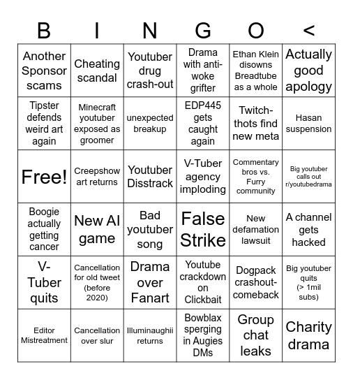 This bingo card has 36 words: Youtube crackdown on Clickbait, Drama over Fanart, Bowblax sperging in Augies DMs, Tipster defends weird art again, Boogie actually getting cancer, V-Tuber agency imploding, Minecraft youtuber exposed as groomer, Illuminaughii returns, Ethan Klein disowns Breadtube as a whole, Dogpack crashout-comeback, Hasan suspension, Drama with anti-woke grifter, Big youtuber quits (> 1mil subs), Creepshow art returns, EDP445 gets caught again, Another Sponsor scams, V-Tuber quits, Commentary bros vs. Furry community, Free!, Youtuber drug crash-out, Youtuber Disstrack, New AI game, False Strike, Bad youtuber song, New defamation lawsuit, Cheating scandal, Twitch-thots find new meta, Cancellation over slur, unexpected breakup, Actually good apology, Charity drama, Editor Mistreatment, A channel gets hacked, Big youtuber calls out r/youtubedrama, Cancellation for old tweet (before 2020) and Group chat leaks.