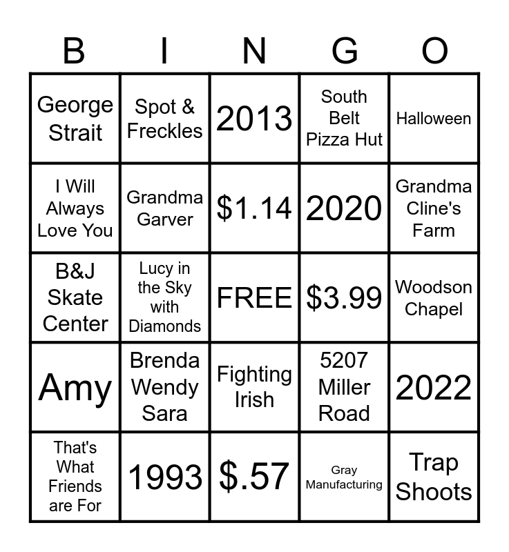 This bingo card has a free space and 24 words: Brenda Wendy Sara, 1993, $1.14, That's What Friends are For, Halloween, George Strait, I Will Always Love You, Spot & Freckles, $3.99, Fighting Irish, 2020, B&J Skate Center, 5207 Miller Road, 2022, Grandma Garver, Gray Manufacturing, Woodson Chapel, 2013, Grandma Cline's Farm, Lucy in the Sky with Diamonds, Trap Shoots, Amy, South Belt Pizza Hut and $.57.