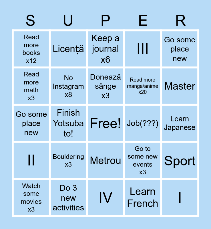 This bingo card has a free space and 24 words: Bouldering x3, Do 3 new activities, Donează sânge x3, Watch some movies x3, Go some place new, Read more books x12, Read more math x3, Licență, Job(???), Metrou, Read more manga/anime x20, Go some place new, Go to some new events x3, Sport, No Instagram x8, Learn French, Learn Japanese, Keep a journal x6, Master, Finish Yotsuba to!, I, II, III and IV.