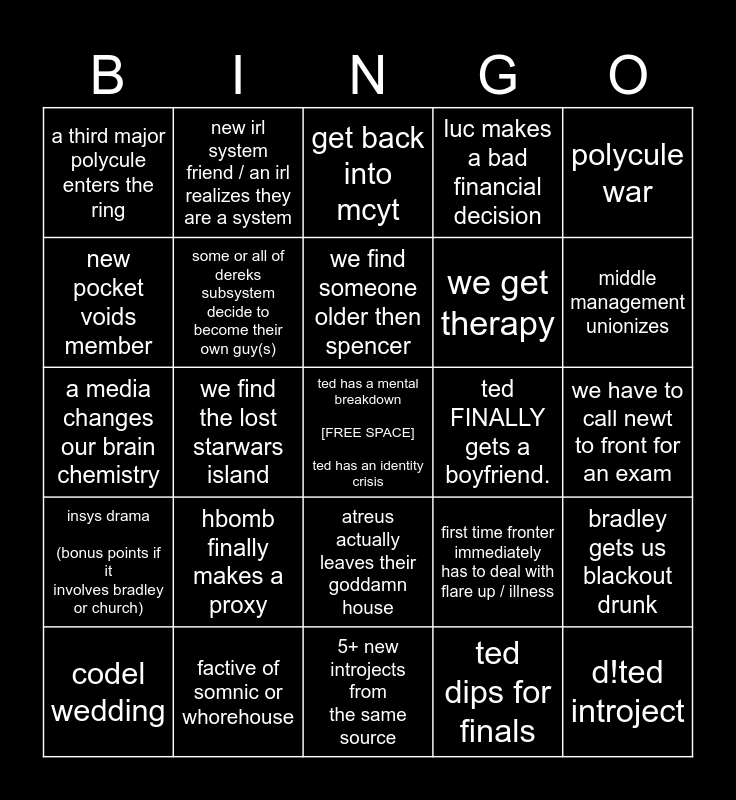 This bingo card has a free space and 24 words: hbomb finally makes a proxy, factive of somnic or whorehouse, we find someone older then spencer, codel wedding, polycule war, a third major polycule enters the ring, new pocket voids member, new irl system friend / an irl realizes they are a system, ted FINALLY gets a boyfriend., atreus actually leaves their goddamn house, we get therapy, a media changes our brain chemistry, first time fronter immediately has to deal with flare up / illness, bradley gets us blackout drunk, some or all of dereks subsystem decide to become their own guy(s), ted dips for finals, we have to call newt to front for an exam, get back into mcyt, middle management unionizes, we find the lost starwars island, d!ted introject, insys drama (bonus points if it involves bradley or church), luc makes a bad financial decision and 5+ new introjects from the same source.