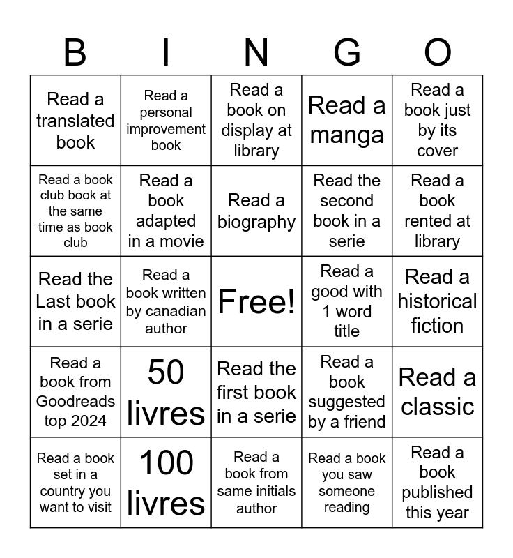 This bingo card has a free space and 24 words: 50 livres, 100 livres, Read a biography, Read a book set in a country you want to visit, Read a book just by its cover, Read a translated book, Read a book club book at the same time as book club, Read a personal improvement book, Read a good with 1 word title, Read the first book in a serie, Read the second book in a serie, Read the Last book in a serie, Read a book suggested by a friend, Read a classic, Read a book adapted in a movie, Read a book you saw someone reading, Read a historical fiction, Read a book on display at library, Read a book rented at library, Read a book written by canadian author, Read a book published this year, Read a book from Goodreads top 2024, Read a manga and Read a book from same initials author.