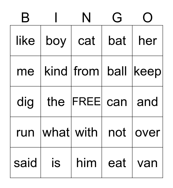 This bingo card has a free space and 24 words: what, is, from, said, her, like, me, boy, can, with, ball, dig, not, over, kind, eat, and, cat, keep, the, van, run, bat and him.
